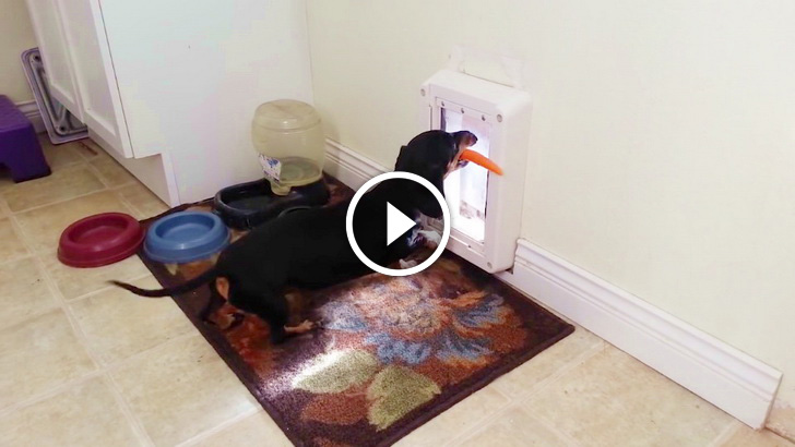 Adorable Dachshund Found An Unusual Treat For A Dog, And Now He Has To Get it Through His Tiny Door!