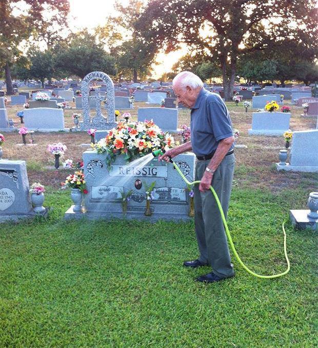 “It’s been over a year now since Mom left us to go to her Heavenly home. Dad goes out to the grave to visit her twice a day. He has a routine where he clips some roses from his rose garden at home and delivers them to Mom.