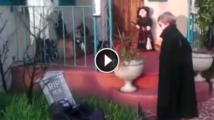 Boy Gets Scared by a Halloween Decoration. Now Watch What his Little Sister does to Protect Him!