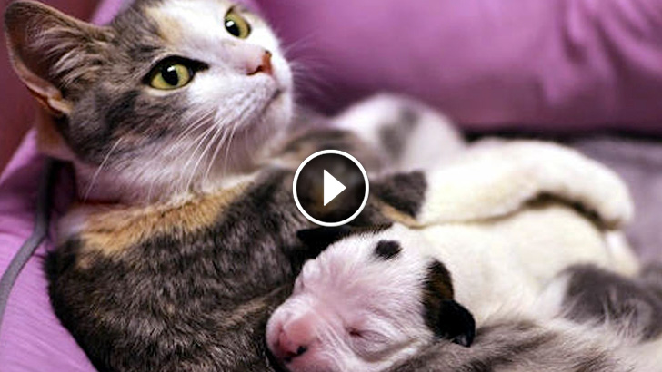 Day Old Pit Bull Puppy Adopted by Mother Cat!