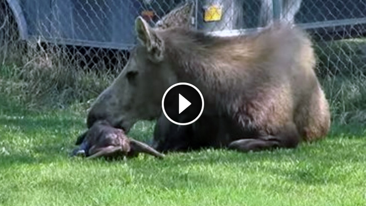 Momma Moose is Busy Grooming her Newborn Baby, but Watch what Appears Behind Her